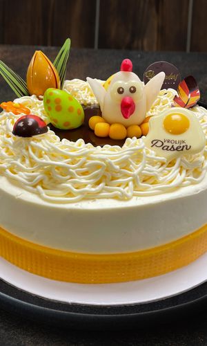 Blok in melkchocolade afgewerkt met paaseitjes.